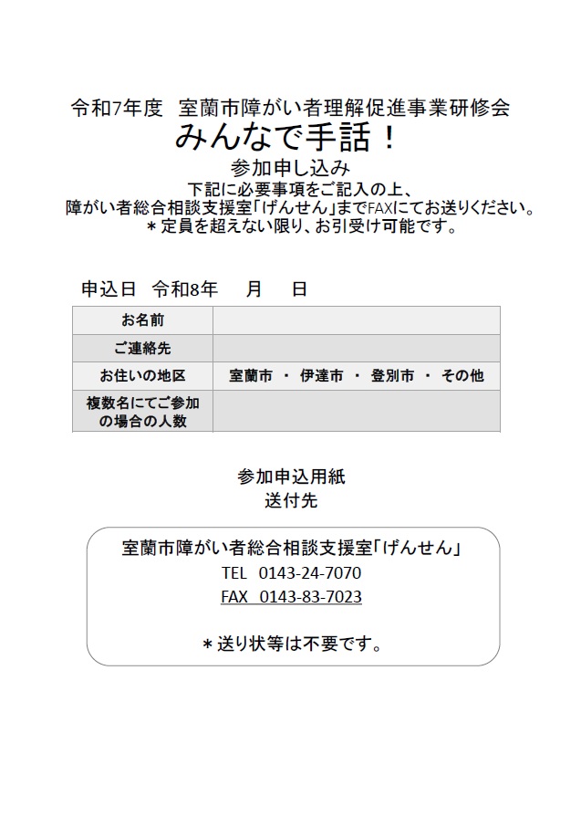 室蘭市障がい者総合相談支援室「げんせん」では、室蘭市と協力し、年1回、「室蘭市障がい者理解促進事業研修会」を開催しております。