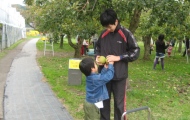 風の強い曇り空でしたが、寒さも気にせず、子ども達も職員も、お腹と手にしたビニール袋がパンパンになるまでリンゴをほおばり、大満足。毎年の恒例行事とあって、高学年になるとリンゴをとる手付きも慣れたもの。年少児には、小学生がていねいにコツを伝授するほほえましい光景も-。