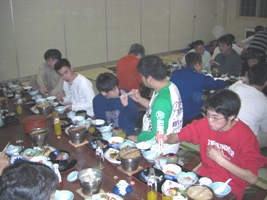 その後、皆さん集い、大広間にて宴会が始まり、おいしい料理に舌鼓(したつづみ)を打ちながらビールでほろ酔い気分になる方などもいて大盛り上がりでした。