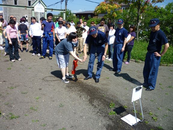 避難誘導訓練や署員さんの講話に続いて、隣接する公園で消火器の使用訓練にもトライ。火災はあってはならないことですが、万が一の事態に冷静に対応できるよう、皆さん、積極的に消火剤の”放水”に挑んでいました。