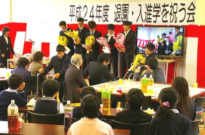 室蘭言泉学園とわかすぎ学園の合同「退園・入進学を祝う会」が3月9日、言泉学園遊戯室で開かれ、社会人としての一歩を踏み出す退園生や入学・進学児らに大きな拍手が送られました。