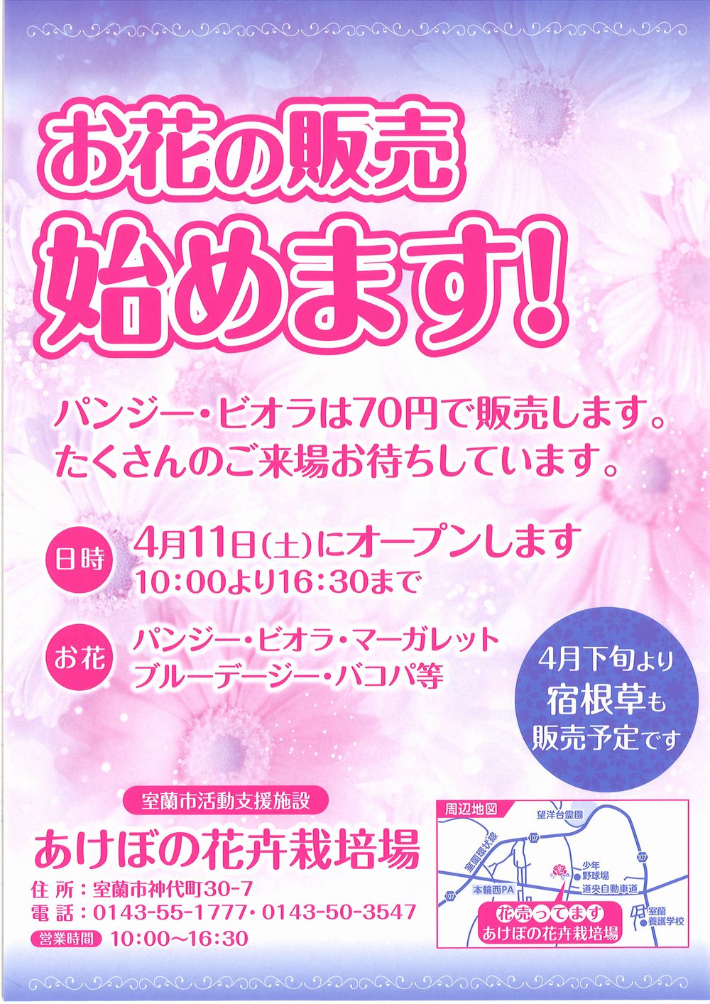 あけぼの花卉栽培場でお花の販売を始めます。(2015年4月10日)