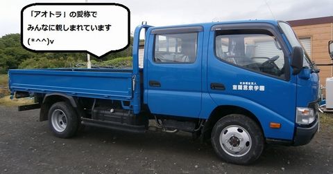 2tトラックで6人乗りの青くてカッコいいトラックでみんなに「アオトラ」と呼ばれ親しまれています。これから「あおぞら」で草刈り・花の配達・市場への出荷など活躍するトラックになります。