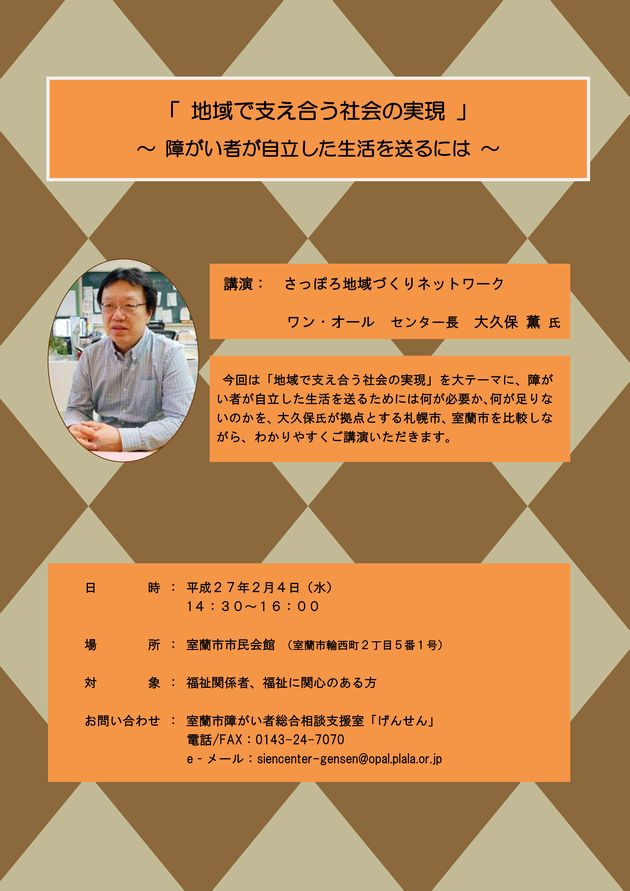 協議会終了後、14:30より、福祉関係者・福祉に興味関心のある方を対象として、学習会を開催いたします。内容として、「 地域で支え合う社会の実現 」~障がい者が自立した生活を送るには~ というテーマで札幌市の基幹相談支援センター ワン・オール センター長 大久保薫氏を講師に招きます。札幌市・室蘭市を比較し、障がい者が地域で自立した生活をするにはどのような支援が必要かをわかりやすくご講演いただく予定ですので、気軽にご参加ください。