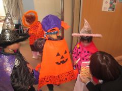 とんがり帽子にカラフルなマントに身を包み、顔にはどこかの原住民族のような化粧を塗り、「トリックー、トリックー。」と唱えると、その愛らしさから不思議とお菓子やおもちゃが集まってきました。お菓子袋を受け取った小さな魔法使いは袋の中身を確認すると満足気に喜びを露わにし、丁寧にお礼を言うと次の事業所へ向かっていきました。