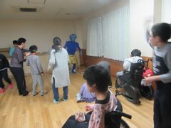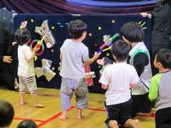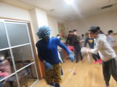 雷の音に混ざって聞こえてくるのは、これまた怖い鬼の声!びっくりしていると玄関から赤鬼がやってきて、子ども達は一斉に豆をまき始めます。「鬼はそと!」必死に豆をぶつけて鬼を追い払い、ホッとしたのもつかの間。再び怖い音が聞こえてきて今度は窓から凶暴な青鬼がやってきました。泣きながら逃げ回る子、余裕の表情を浮かべている子、何が起こっているのかわからなくてきょとんとしている子など、反応は様々でしたが、「鬼はそと」「福はうち」の声は学園中に響き渡りました。