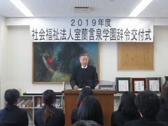 社会福祉法人室蘭言泉学園の2019年度辞令交付式が4月1日(月)、わかすぎ学園会議室で開かれました。3名の新入職員のほか、苫小牧に開所された「はまなす」への異動者や昇格者など合わせて21名の辞令が交付されました。