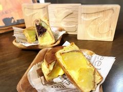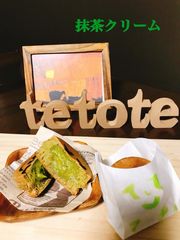 カフェてとて の「顔」ともいえる「おやき」は、あんとクリームの2種類があります。そこに待望のニューフェースが誕生しました。まっちゃクリームとピザ味です!この2種類が加わり、現在カフェてとてには4種類のかわいい顔が並んでいます。